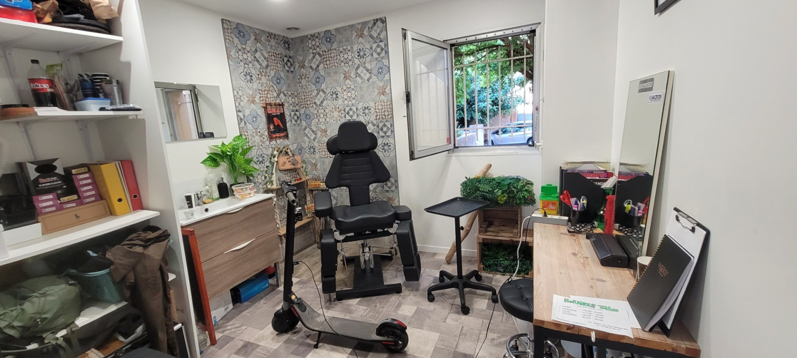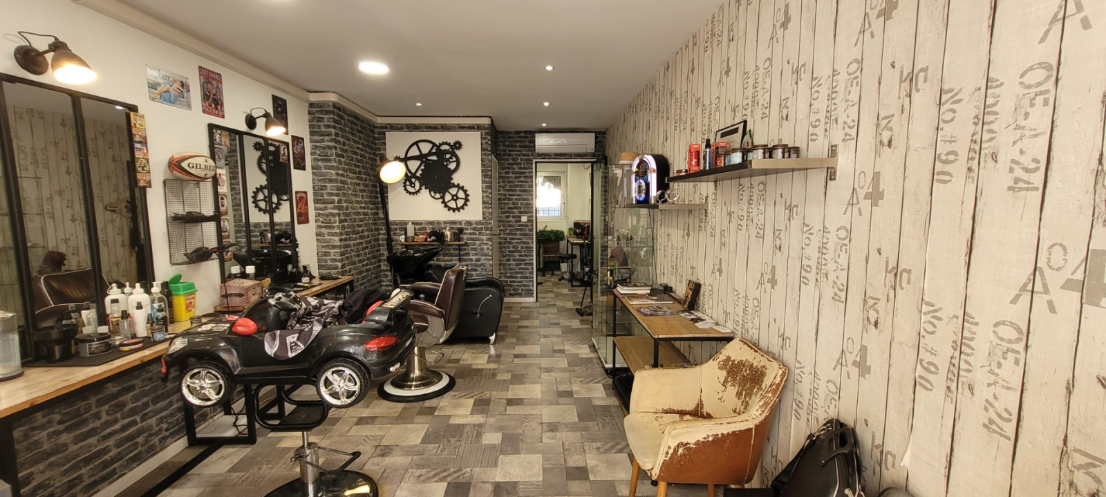 Salon de coiffure climatisé réversible, composé de postes de coiffage ou barber, de bacs de lavage, d'une réserve indépendante faisant office de rangement ou d'une pièce pour esthétique, d'un WC indépendant, point d'eau dans toutes les pièces, local sécurisé par rideau métallique.